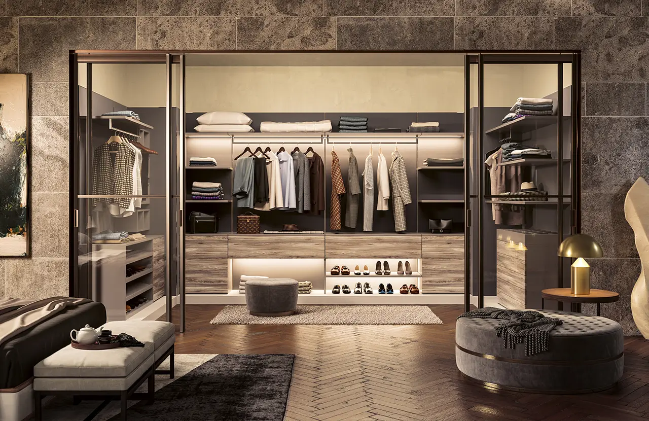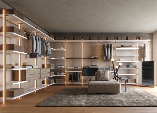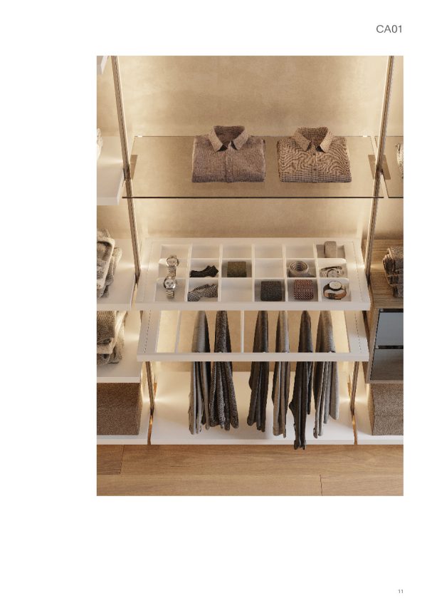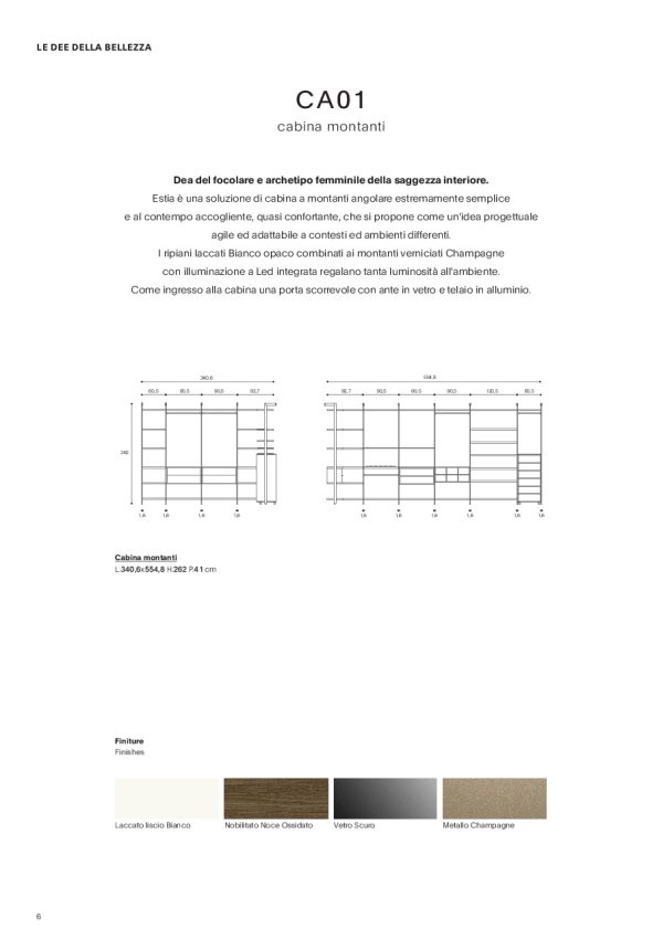 Estia è una soluzione di cabina a montanti angolare estremamente semplice e al contempo accogliente, quasi confortante, che si propone come un’idea progettuale agile ed adattabile a contesti ed ambienti differenti. I ripiani laccati Bianco opaco combinati ai montanti verniciati Champagne con illuminazione a Led integrata regalano tanta luminosità all’ambiente.
