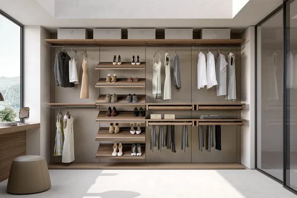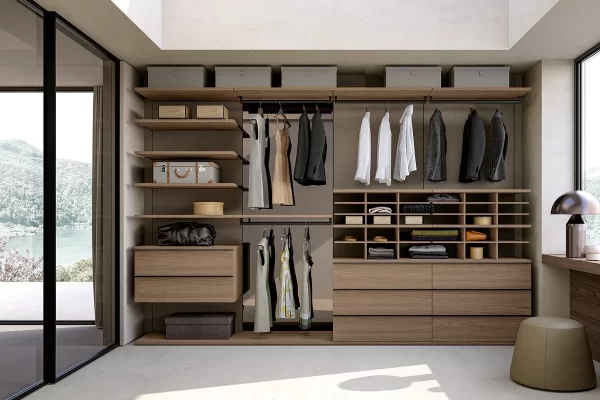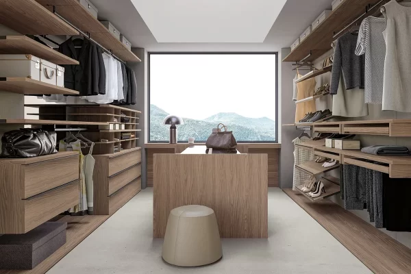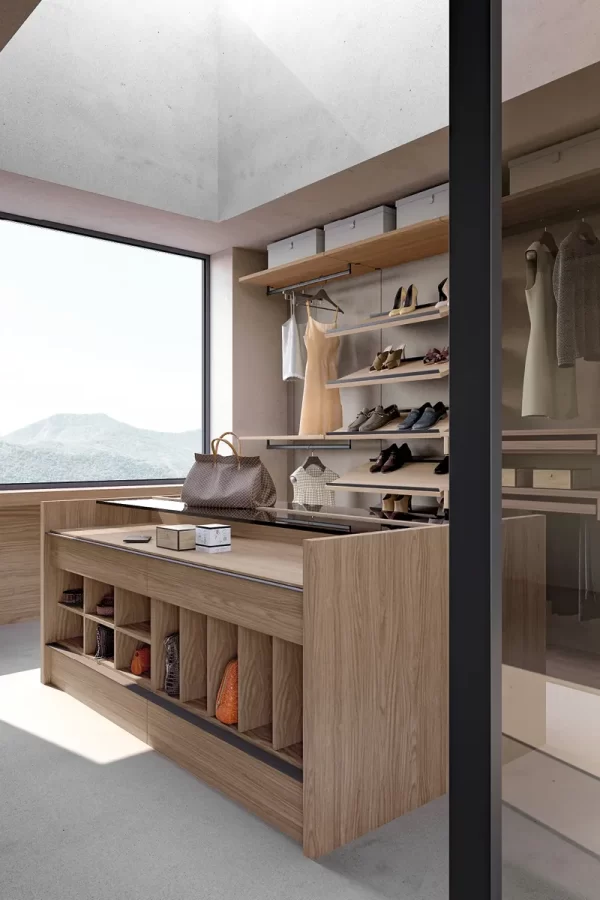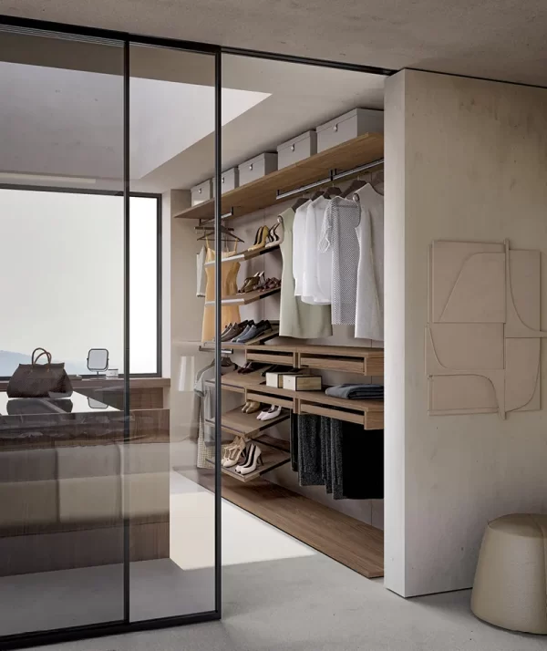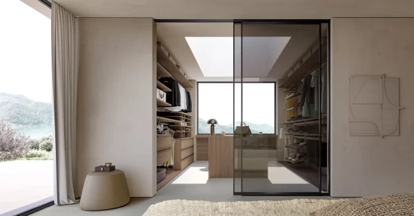 la cabina Up&Down, che mette a disposizione tanti elementi di servizio che trovano poi il loro punto focale nella funzionalità di un‘isola centrale freestanding, perfetta per aggiungere spazio contenitore alla cabina armadio, fornendo altresì un prezioso punto d’appoggio.Se lo spazio lo consente, aggiungere un elemento centrale all’interno della cabina armadio permette di coronare il sogno di un guardaroba a vista perfetto sia dal punto di vista estetico che funzionale. L’isola per la cabina armadio è un elemento freestanding e centrostanza che può essere progettato a misura delle esigenze del padrone di casa,può essere personalizzata con elementi ad alveare, ripiani o cassetti. A impreziosire il tutto, uno splendido ripiano in vetro, capace di regalare un punto d’appoggio a servizio della routine quotidiana. La cabina è realizzata con pannelli in finitura Canvas, con l’inserto di un pannello con Specchio Bronzo. Le mensole e le attrezzature sono in finitura Noce Louisiana, mentre i tubi appendiabiti sono stati scelti in finitura Ghisa Metal. L’isola Domino è anch’essa in finitura Noce Louisiana ed è attrezzata con scomparti alveari e cassetti con maniglia, la cui finitura Ghisa Metal richiama quella dei tubi appendiabiti. A impreziosire il tutto, creando anche un elemento divisorio, ci pensa la porta scorrevole Dea in vetro Fumé, con telaio in Ghisa Metal.