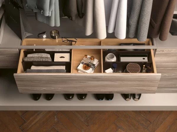 La cabina armadio moderna 01, dal design moderno e innovativo, combina con maestria estetica e funzionalità, trasformando lo spazio in una vera e propria vetrina. Gli appendiabiti ordinati, illuminati da luci LED, e i grandi cassettoni realizzati con le eleganti finiture della collezione Melograno, dominano la scena insieme ai ripiani e ai vani a giorno, conferendo un look sofisticato e ricercato all’intera composizione.