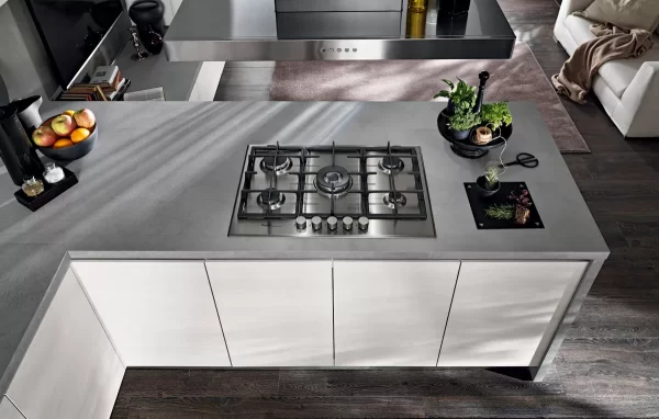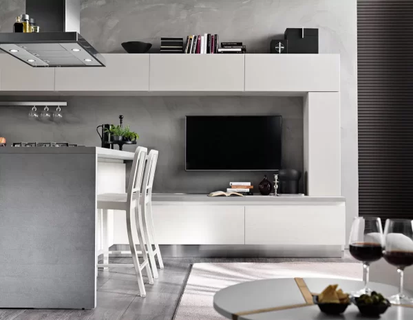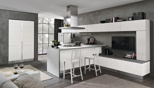 La versione Tokyo 04 è una versione del modello Tokyo dalle geometrie lineari rese ancora più eleganti dal contrasto tra olmo bianco e laccato. Questa cucina moderna dallo stile minimal è caratterizzata da una cappa in acciaio posta sopra una efficiente penisola centrale. E’ possibile notare come, nella parte alta e bassa di questa versione del modello Tokyo, gli sportelli rettangolari, raccordati da una colonna pensile in appoggio sulla destra, siano disposti in maniera equilibrata e parallela, creando praticità e armonia. La sensazione che suscita la continuità tra l’ambiente della cucina e quello del soggiorno è quella di trovarsi in un ambiente confortevole e funzionale. Ideale per openspace.