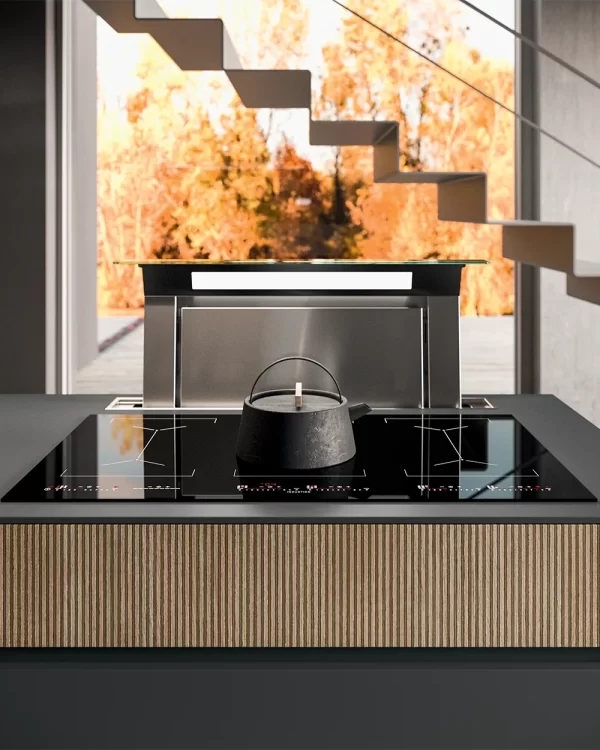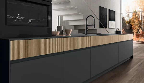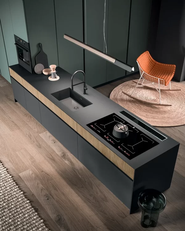 Colonne e basi del living in laccato opaco Silk Verde Comodoro. Le basi della penisola operativa sono in laccato opaco Silk Nero Ingo. Il piano di lavoro è in stratificato con laminato Hpl Fenix Nero Ingo dallo spessore minimo di 1 cm con la vasca integrata.Il cannetè è una raffinata tecnica decorativa capace di creare un effetto tridimensionale sulle superfici che ricopre.